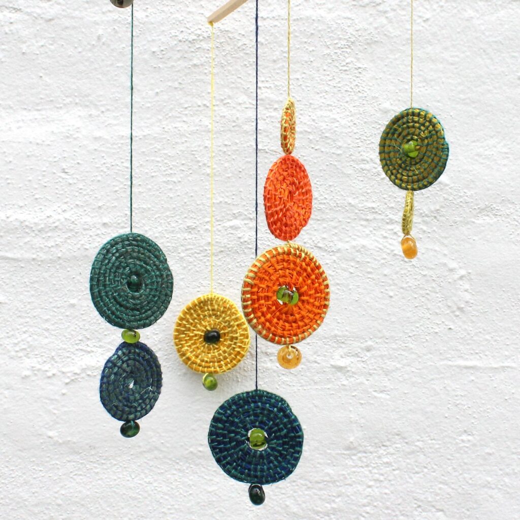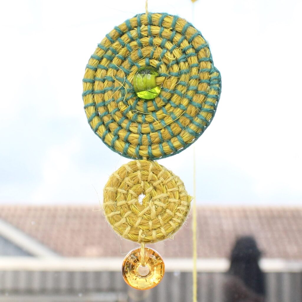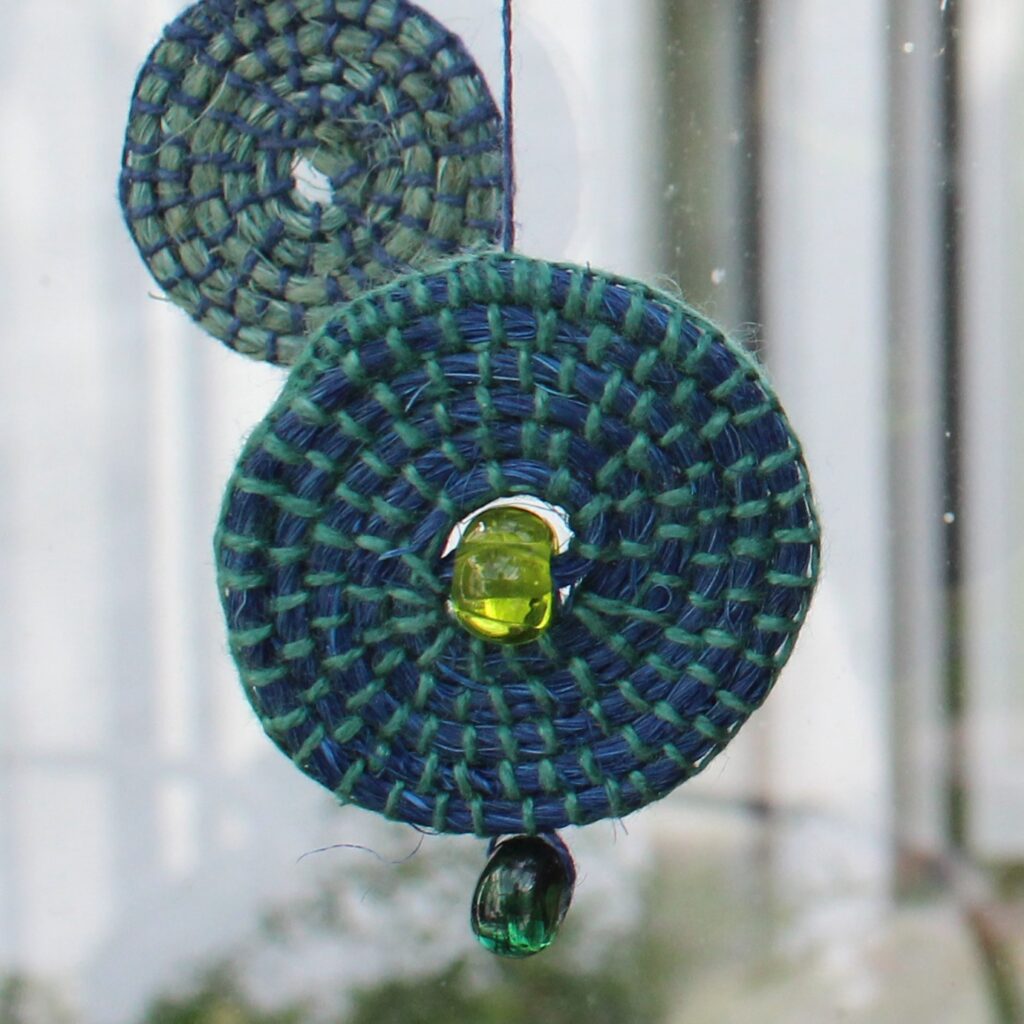 The month of September is marked by the simple coaster. And the late summer colors are making their presence felt. The result is a mobile, with beads at the center that glow when the sun shines.