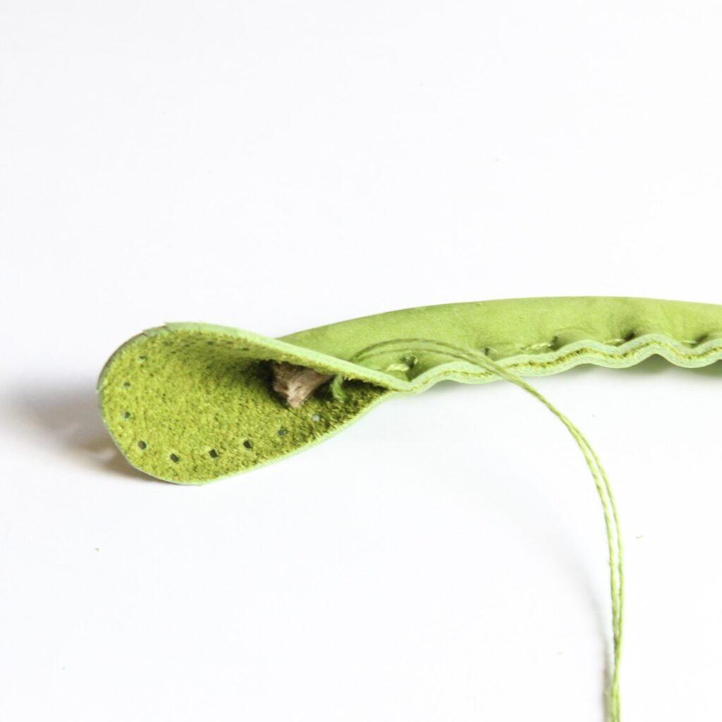Montering af hanken blev planlagt, før jeg startede på at binde, så læder og snøre til hank er valgt samtidig med sjæl og bindetråd til selve tasken.